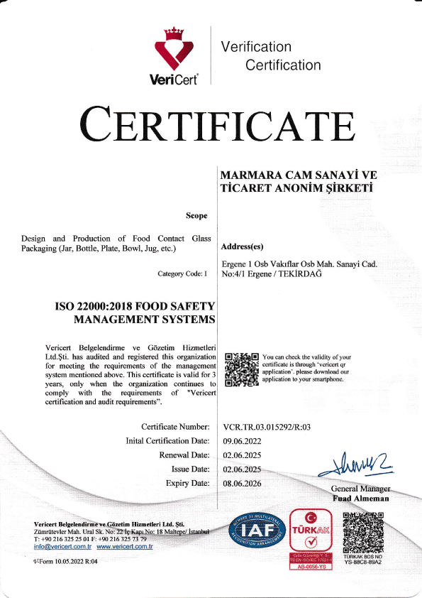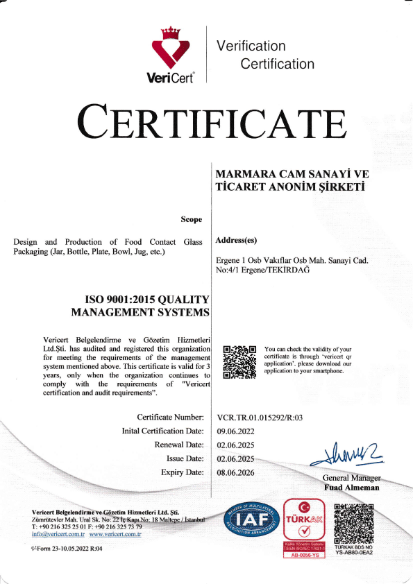 Marmara Cam Sanayi Ticaret A.Ş. sektörde performansına özenilen, çevre ve yaşam değerlerine saygılı öncü bir şirket olmaya önem vermekte ve Küresel İlkeler Sözleşmesi ilkelerine uygun, çevre ve insan sağlığı yasalarıyla uyumlu hareket etmektedir. Bu kapsam içerisinde firmamız, kalite yönetim sistemimizi sürekli iyileştirecek hedefler belirlemeyi, bu hedefleri yapacağı toplantılarda gözden geçirmeyi, çalışanlara sağlıklı, güvenli ve temiz bir iş ortamı sunmayı amaçlamaktadır.